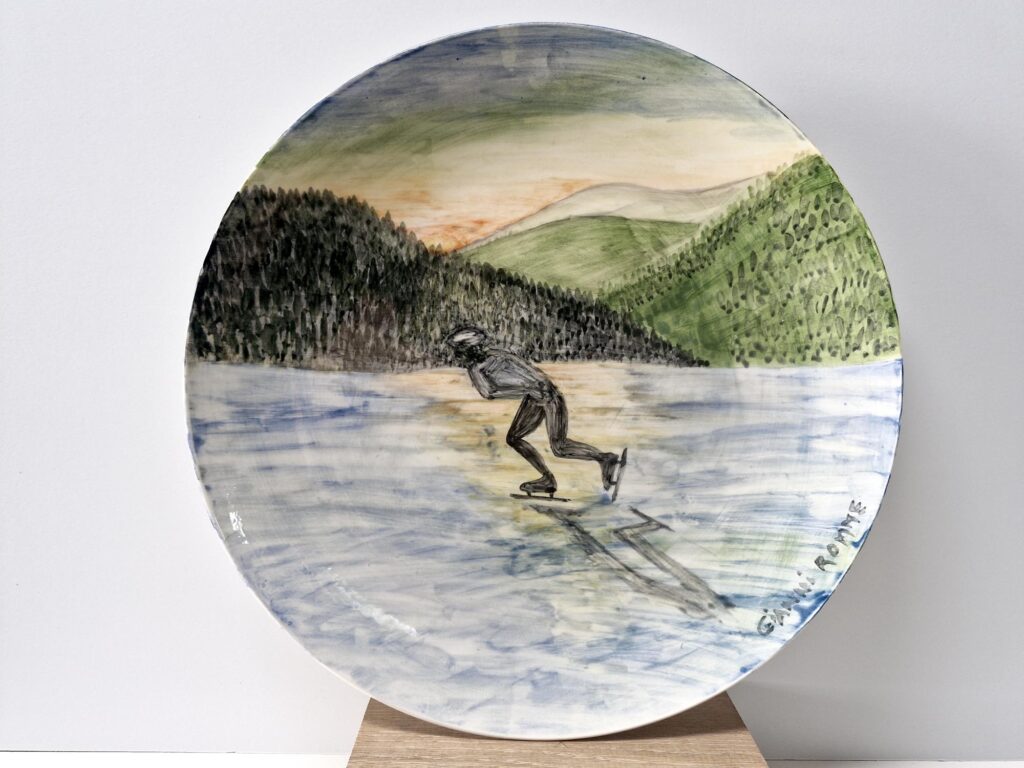 Gianni Romme over zijn beschilderde bord “Free Bird” : Het ultieme gevoel van vrijheid is schaatsen op natuurijs. Het ijs laat zich horen als je erover heen glijd. Dit is magisch en kan voor mij niet lang genoeg duren