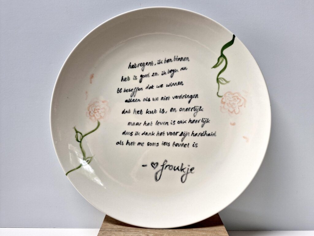 ‘woordkunstenares’ beschrijft Froukje wellicht het beste, en toch weet je dat het haar tekort doet. Welke fan wil nu niet dit unieke bord met prachtige tekst van haar?
